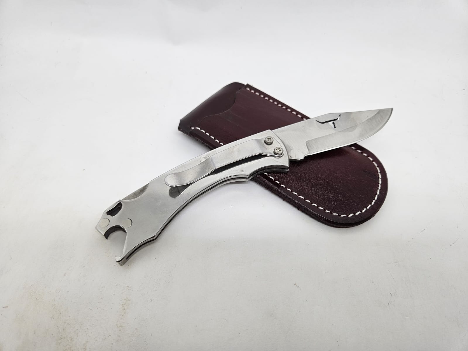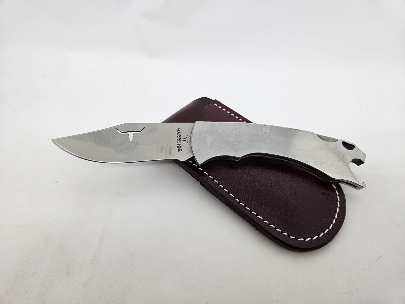 Canivete prático e resistente, ideal para uso diário e atividades ao ar livre. Possui lâmina de aço inoxidável, abridor de garrafa integrado e acompanha bainha de couro para transporte seguro.