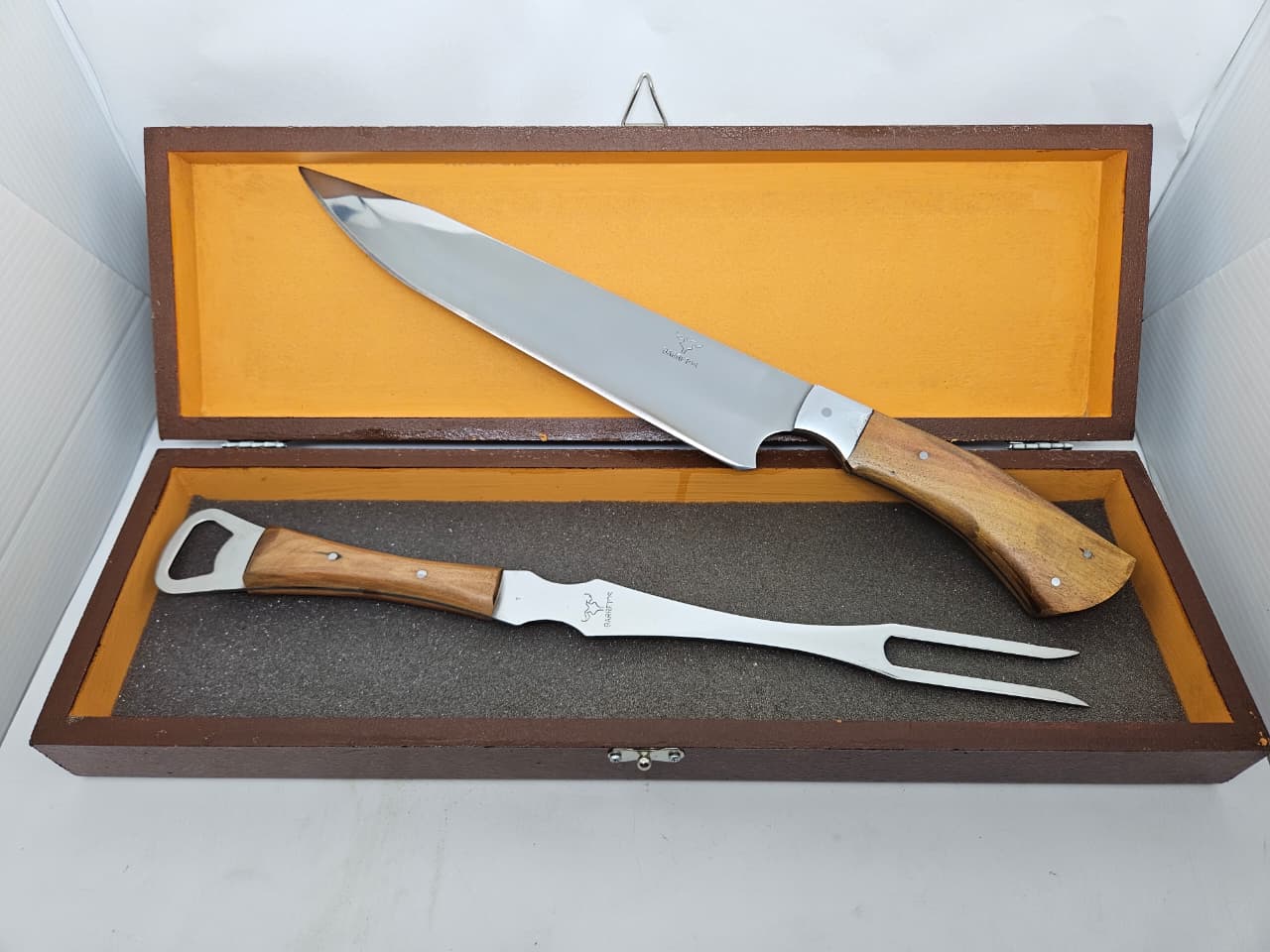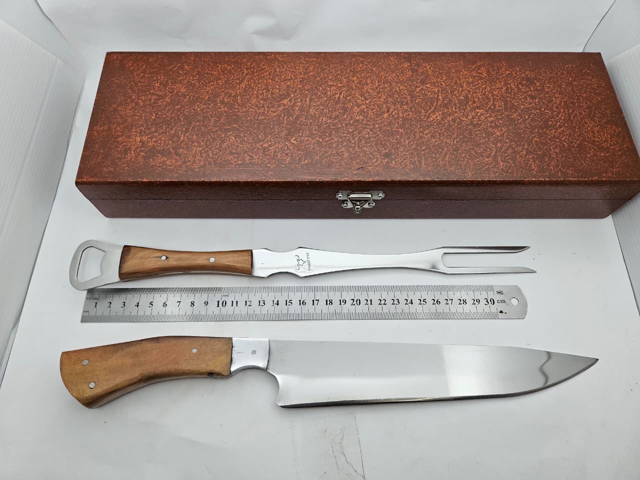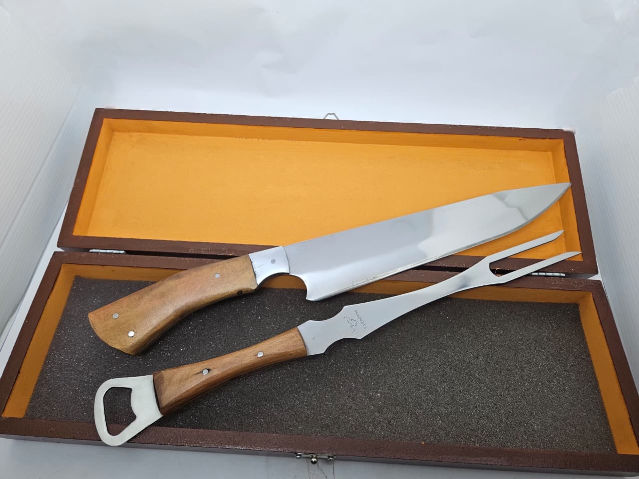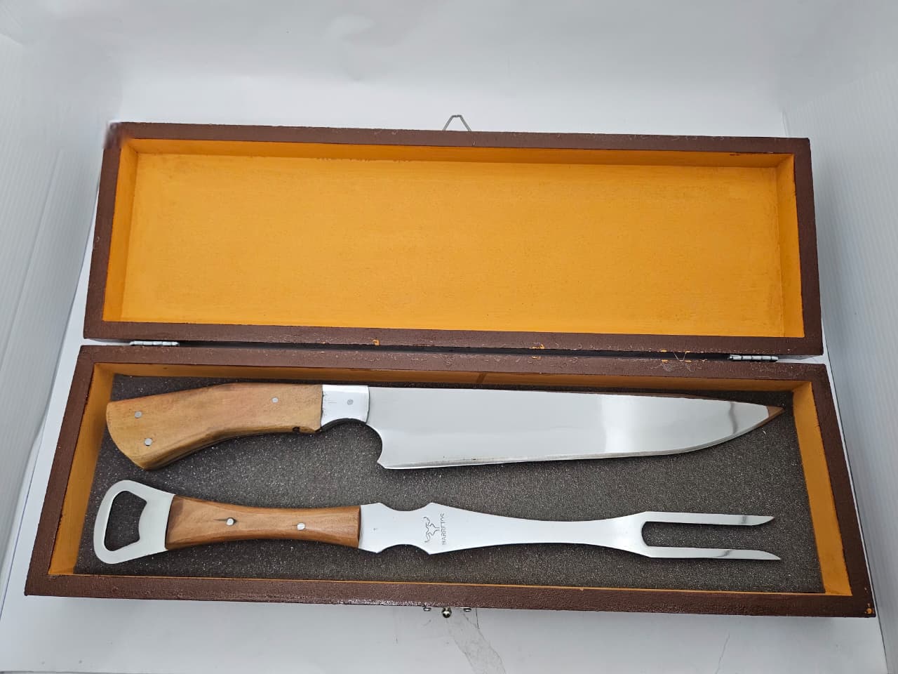 Kit ideal para churrasco, composto por faca e garfo de alta qualidade, ambos com cabo de madeira e lâmina em aço inox. Acompanha estojo elegante para armazenamento e transporte.
